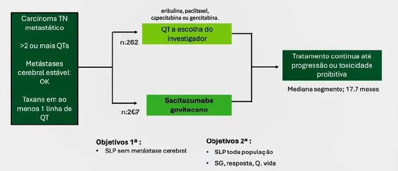 O ASCENT trial é um estudo fase III, randomizado, que incluiu pacientes com Câncer de Mama triplo-negativo metastático, previamente tratados com, pelo menos, duas linhas de quimioterapia, incluindo uma para a doença metastática.O objetivo principal foi avaliar a sobrevida livre de progressão (SLP) em pacientes sem metástases cerebrais, enquanto os objetivos secundários incluíram SLP para toda a população do estudo, sobrevida global, taxa de resposta e qualidade de vida.